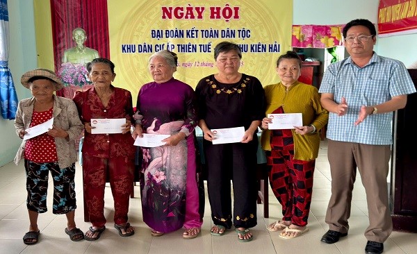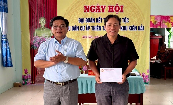 Quang cảnh: Đồng chí Nguyễn Văn Đượm, Phó Chủ tịch Ủy ban MTTQ Việt Nam đặc khu, Chủ tịch Hội Nông dân đặc khu Kiên Hải trao quà cho các hộ khó khăn ấp Thiên Tuế