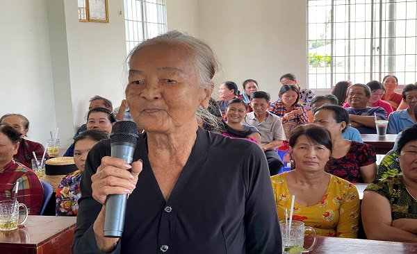Quang cảnh: Cử tri Trần Thị Nhiễu, ngụ tổ 06 ấp Thiên Tuế, xã Lại Sơn kiến nghị tại buổi tiếp xúc cử tri.