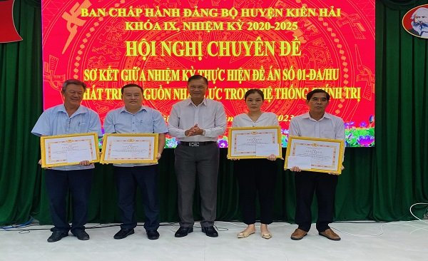 Dịp này, Ban Thường vụ Huyện ủy Kiên Hải đã tặng giấy khen cho 4 tập thể và 6 cá nhân có thành tích tốt trong việc triển khai thực hiện Đề án 01-ĐA/HU ngày 11-8-2023 của Huyện ủy về phát triển và nâng cao chất lượng nguồn nhân lực trong hệ thống chính trị đến năm 2025 và tầm nhìn đến năm 2030./.