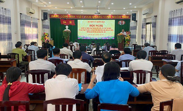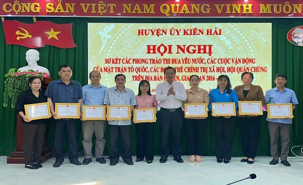 Quang cảnh: Đồng chí Lê Minh Trị - Phó Chủ tịch UBND huyện Kiên Hải trao giấy khen cho các tập thể và cá nhân.