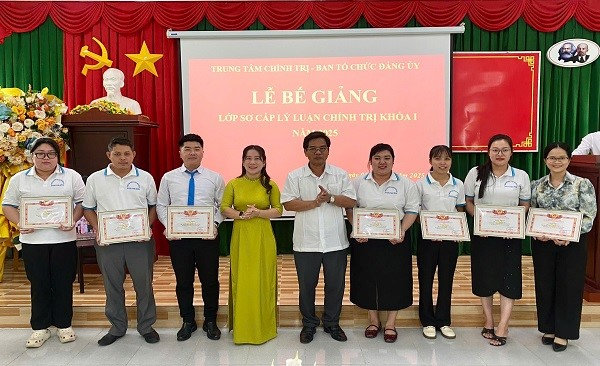 Quang cảnh: Đồng chí Nguyễn Quốc Tuấn, Bí thư Đảng ủy đặc khu Kiên Hải và đồng chí Lê Kim Thùy, Giám đốc Trung tâm chính trị đặc khu Kiên Hải trao bằng tốt nghiệp cho các học viên lớp Sơ cấp lý luận chính trị khóa I năm 2025