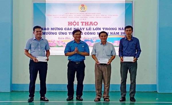 Quang cảnh: Đồng chí Dương Đình Bắc - Chủ tịch LĐLĐ huyện Kiên Hải Trao giải cho các đội đạt thành tích cao tại Hội thao năm 2024