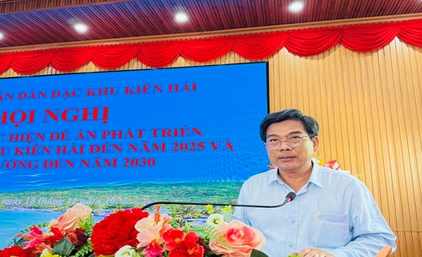 Quang cảnh: Đồng chí Nguyễn Quốc Tuấn, Bí thư Đảng ủy đặc khu Kiên Hải, phát biểu chỉ đạo tại Hội nghị.