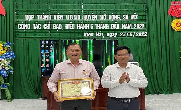 Quang cảnh: Đồng chí Trần Quốc Việt, Bí thư Huyện ủy Kiên Hải nhận danh hiệu Chiến sĩ thi đua của Chủ tịch Ủy ban nhân dân tỉnh Kiên Giang.