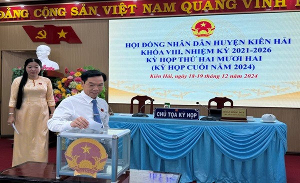 Quang cảnh: Các vị đại biểu bỏ phiếu bầu bổ sung Ủy viên Ủy ban nhân dân huyện Kiên Hải