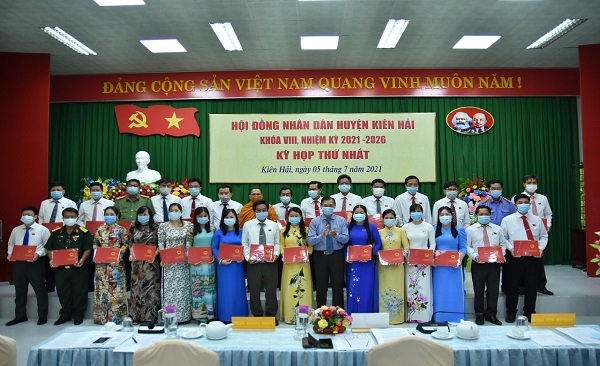 Quang cảnh: Đồng chí Trần Quốc Việt - Bí thư Huyện ủy, trao Giấy chứng nhận cho Đại biểu HĐND huyện Kiên Hải khóa VIII, nhiệm kỳ 2021-2026.