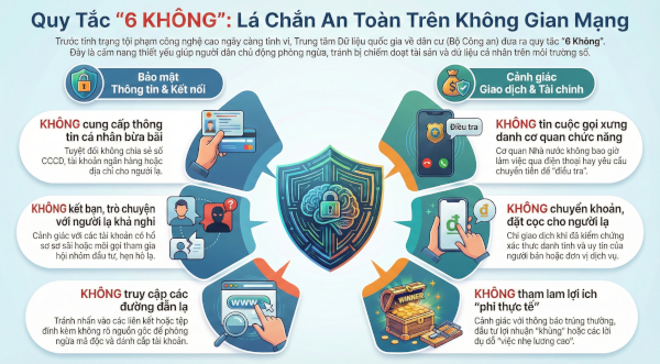 Thời gian gần đây, tình hình tội phạm công nghệ cao diễn biến ngày càng phức tạp với nhiều thủ đoạn tinh vi nhằm chiếm đoạt tài sản của người dân. Trước thực trạng này, Trung tâm Dữ liệu quốc gia về dân cư (Bộ Công an) đã đưa ra khuyến cáo "Quy tắc 6 Không", xem đây là "lá chắn" quan trọng để mỗi cá nhân tự bảo vệ mình trên môi trường số.