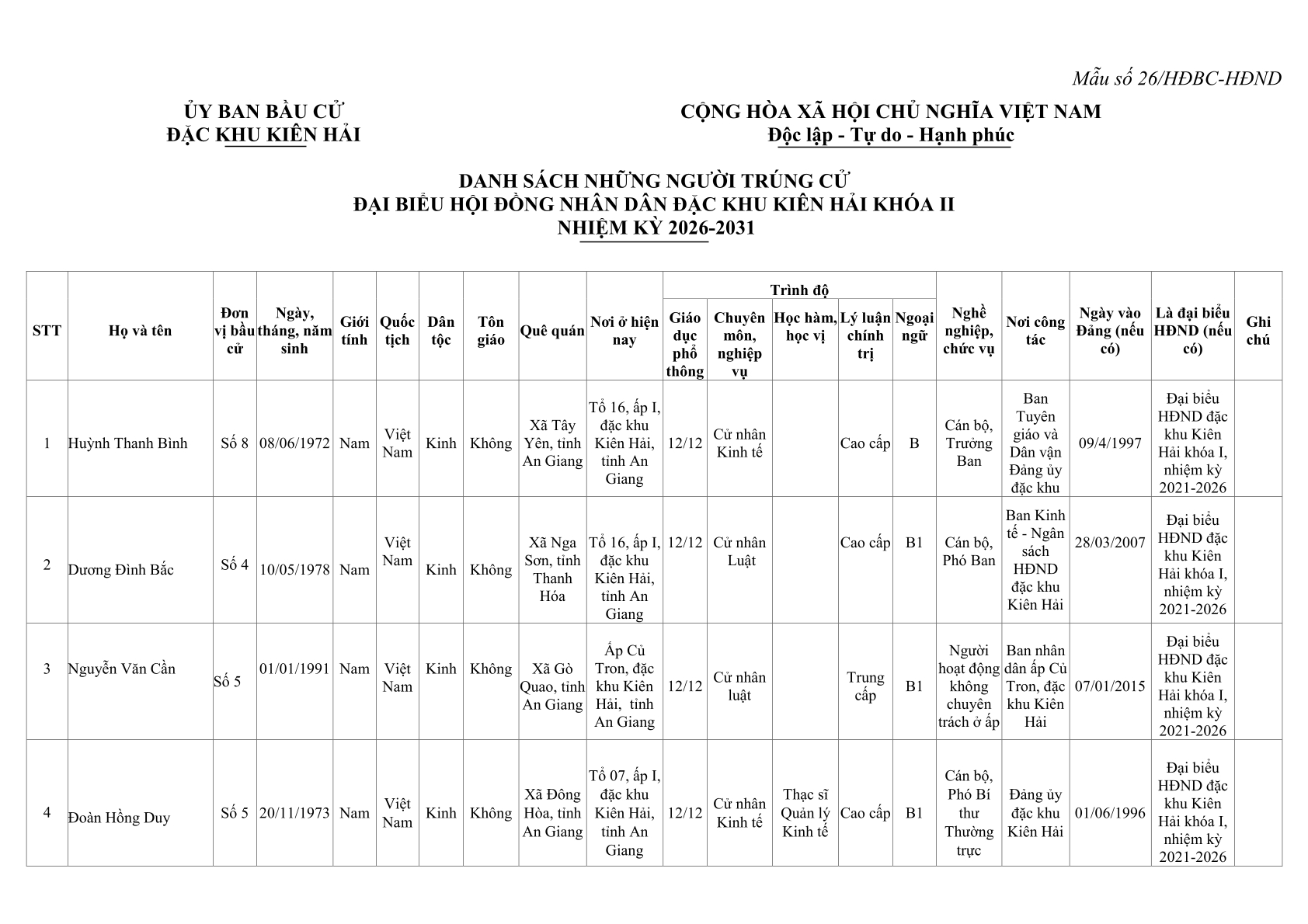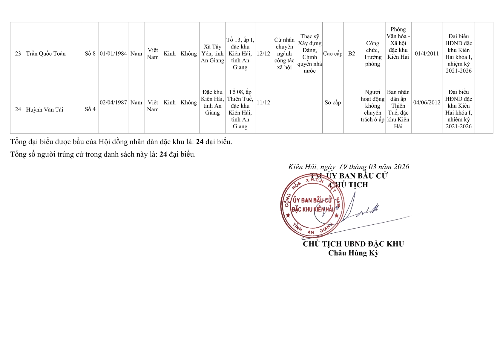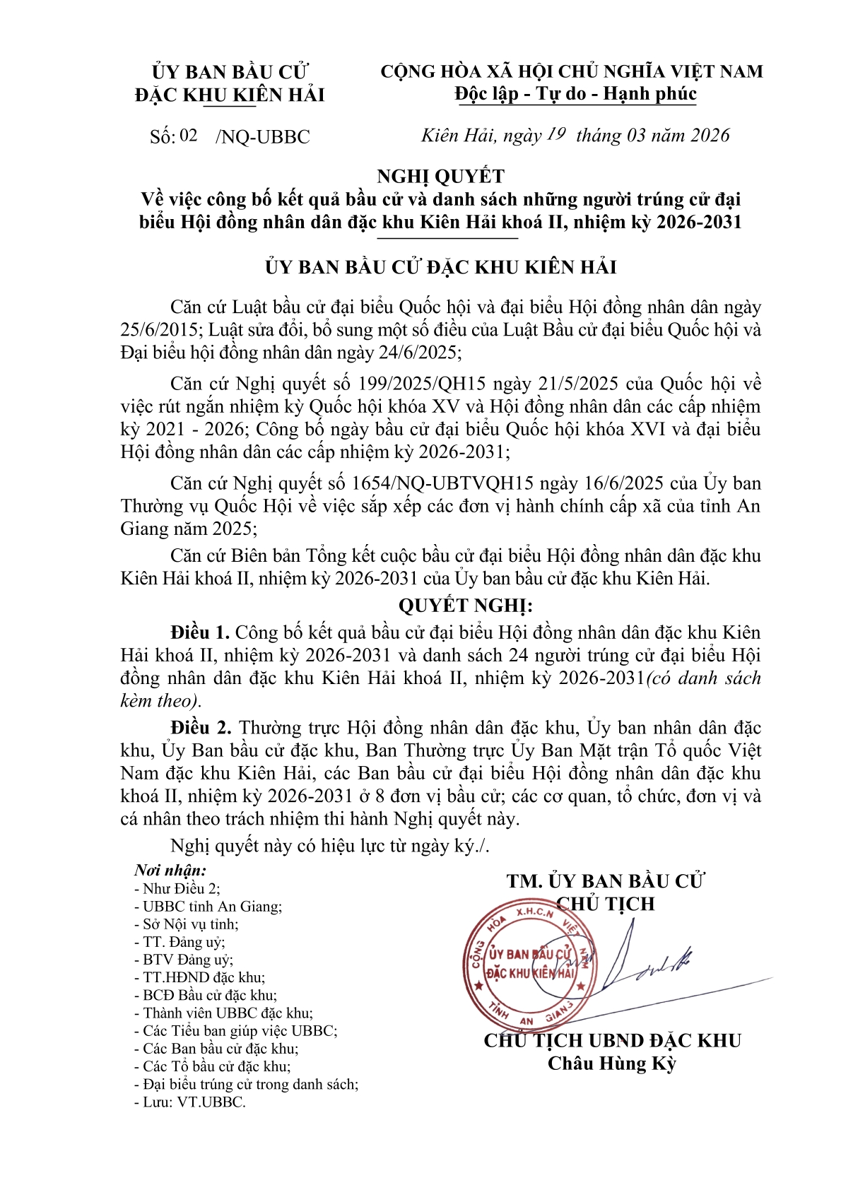 Nghị quyết số 02/NQ-UBBC ngày 19/3/2026 của Ủy ban bầu cử đặc khu Kiên Hải về việc công bố kết quả bầu cử và danh sách những người trúng cử đại biểu Hội đồng nhân dân đặc khu Kiên Hải khoá II, nhiệm kỳ 2026-2031
