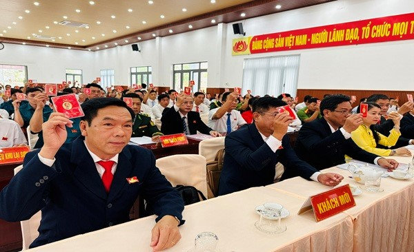 Quang cảnh: Đại biểu biểu quyết nội dung chương trình Đaị hội.