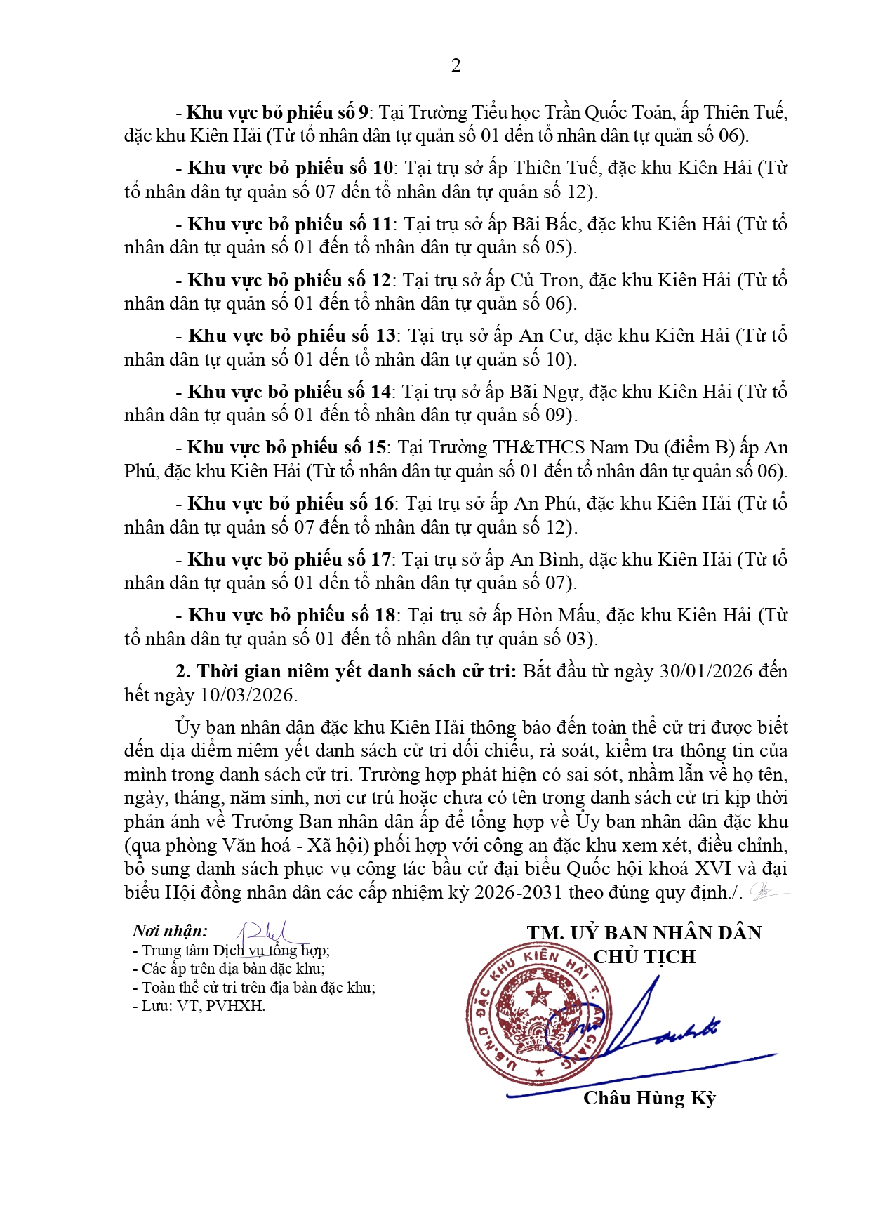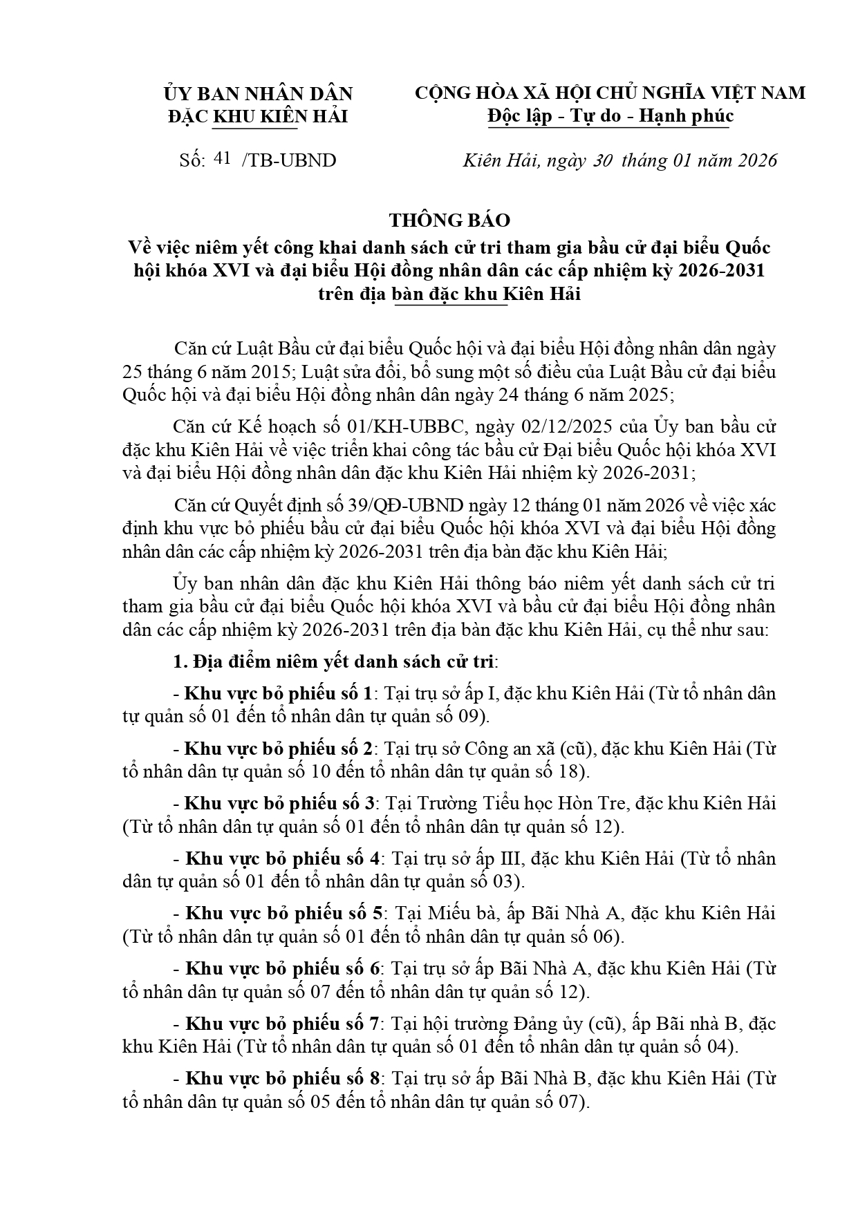 Thông báo số 41/TB-UBND ngày 30/01/2026 của Ủy ban nhân dân đặc khu Kiên Hải về việc niêm yết công khai danh sách cử tri tham gia bầu cử đại biểu Quốc hội khóa XVI và đại biểu Hội đồng nhân dân các cấp nhiệm kỳ 2026-2031
