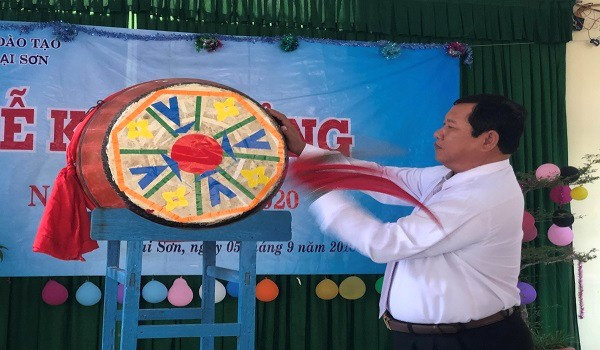 Đồng chí Ong Văn Ngay, Bí thư Huyện ủy - Chủ tịch HĐND huyện, đánh hồi trống khai giảng năm học mới 2019 - 2020