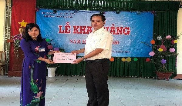 Đồng chí Lê Minh Trị, Phó Chủ tịch UBND huyện trao học bổng tượng trưng cho Trường THPT Lại Sơn huyện Kiên Hải