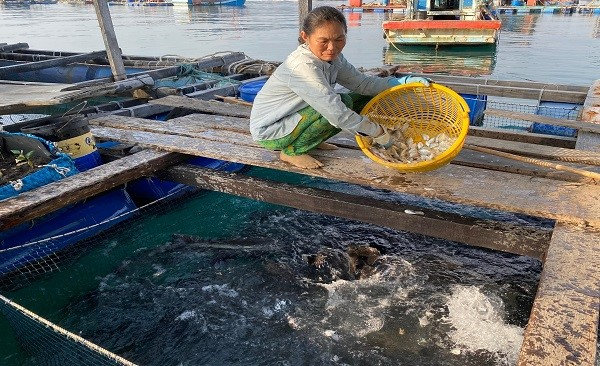 Quang cảnh: Cô Trần Thị Hội, ngụ ấp An Phú, xã Nam Du, huyện Kiên Hải cho cá ăn.