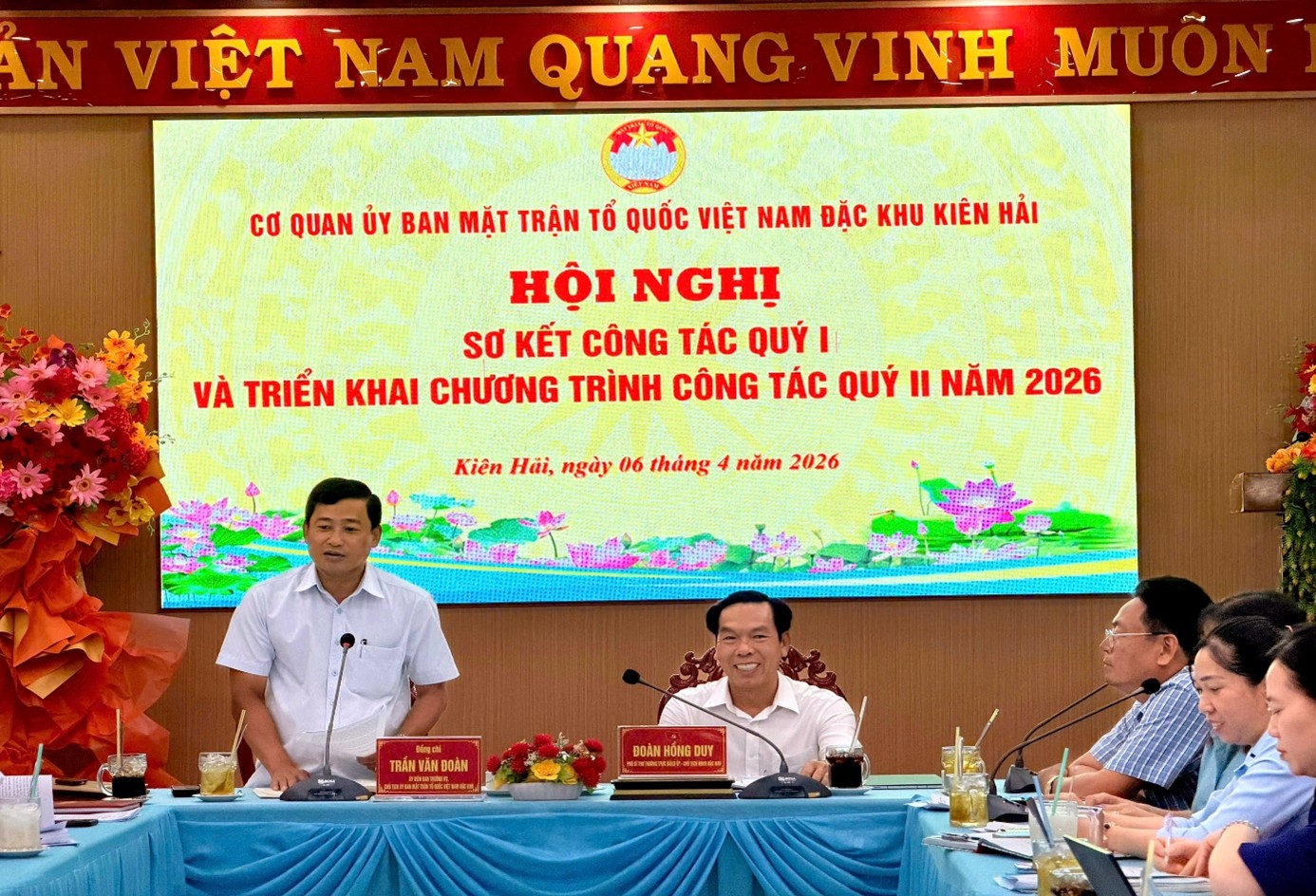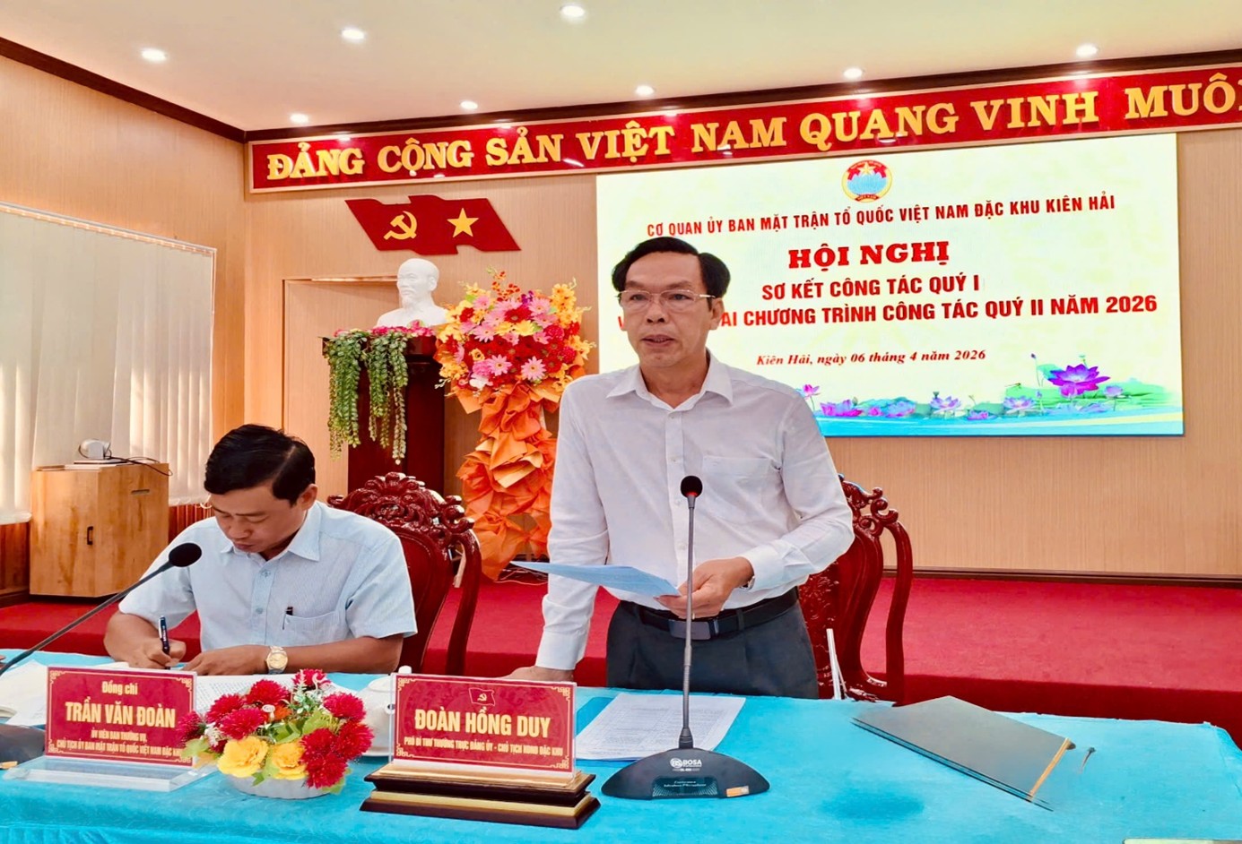 Quang cảnh Đồng chí Trần Văn Đoàn, Ủy viên Ban thường vụ, Chủ tịch Ủy ban MTTQ Việt Nam đặc khu phát biểu tại Hội nghị Sơ kết quý I năm 2026