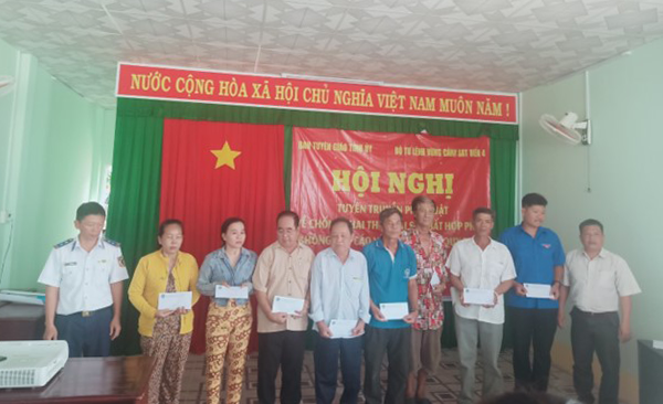Nhân dịp buổi tuyên truyền ông Bùi Xuân Nhớ, Thiếu tá Bộ Tư lệnh Vùng Cảnh sát biển 4 thay mặt đoàn trao 10 suất quà, trị giá 10 triệu đồng cho 10 hộ gia đình chính sách, người có công và hộ có hoàn cảnh đặc biệt khó khăn, nhằm để khích lệ tinh thần cho hộ khó khăn vươn lên trong cuộc sống hòa nhập với cộng đồng ./.